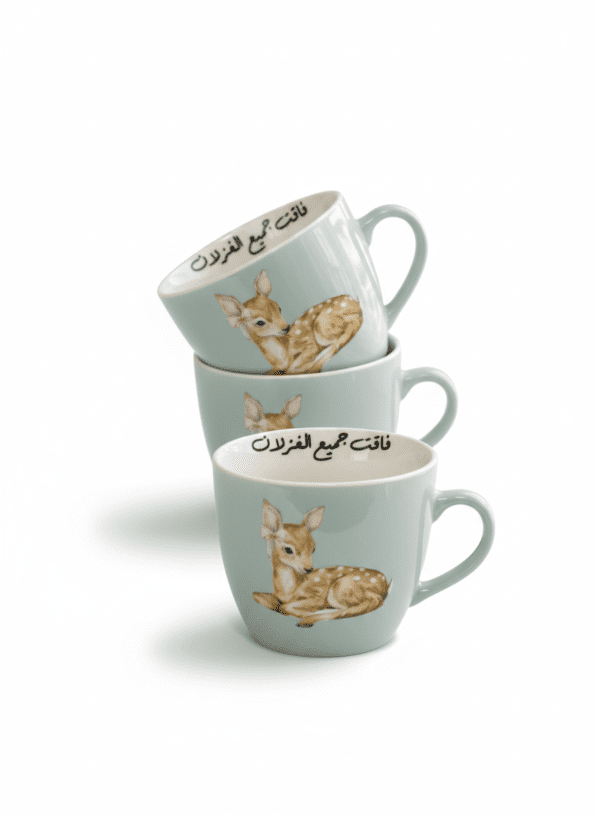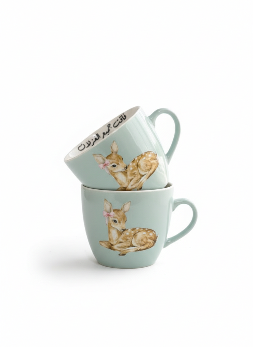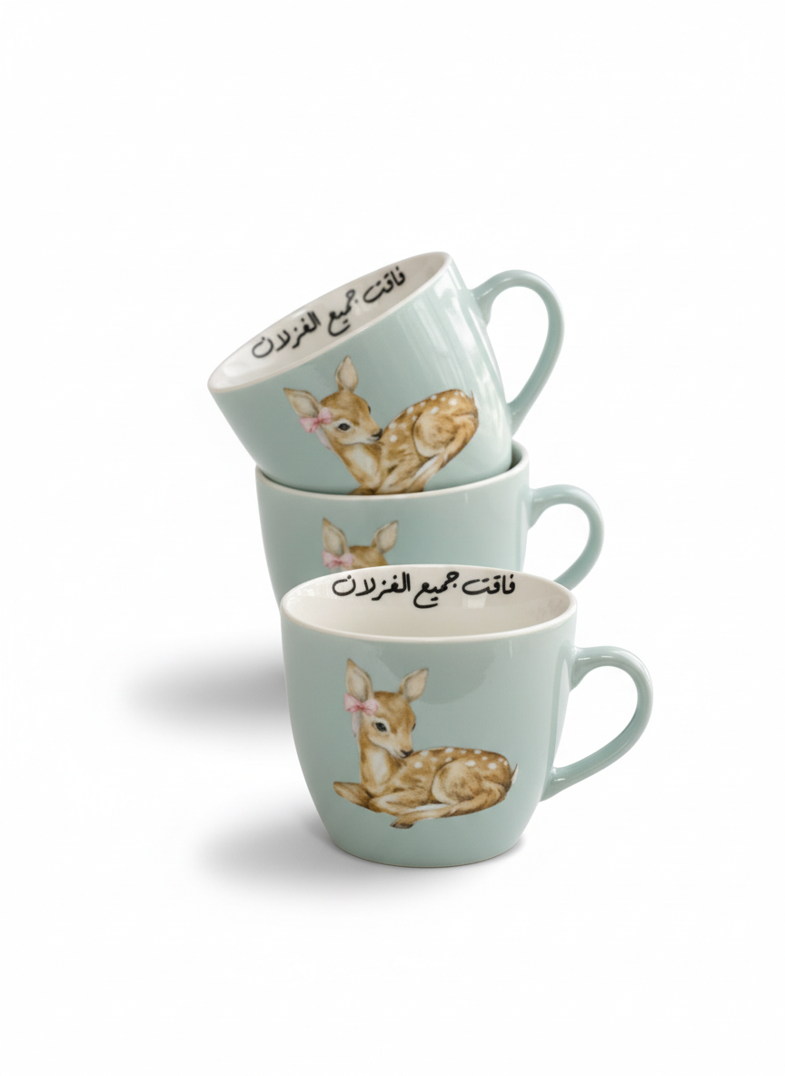 رقة تخطف الأنظار تخيلي تصحي الصبح وتعملي مشروبك المفضل بهيك كوب؟ 🥹💕 لون هادي ورسمة غزال رقيقة بفيونكة صغيرة، ومكتوب عليه “فاقت جميع الغزلان” بخط عربي بياخد العقل. هاد الكوب مش بس قطعة لركن القهوة، هاد رسالة حب وتقدير لنفسك كل يوم إنك مميزة وما بتشبهي حدا. متوفر بألوان (الوردي، المنت جرين، والأصفر الهادي) ليرضي كل الأذواق ويحلي كل رشفة.