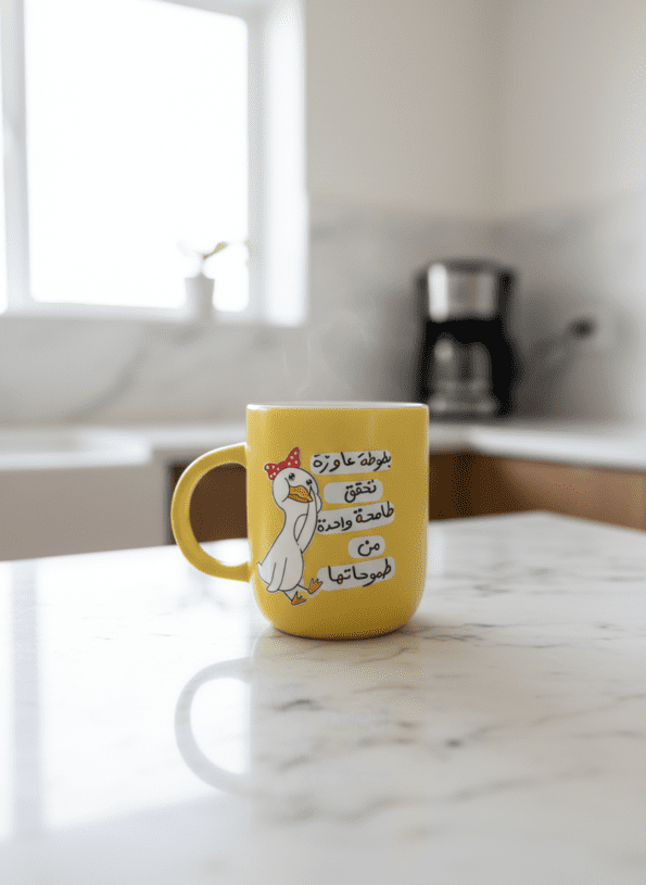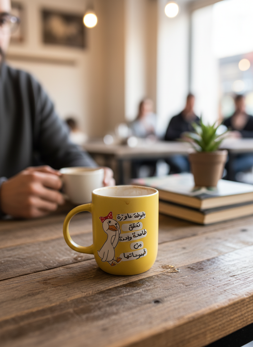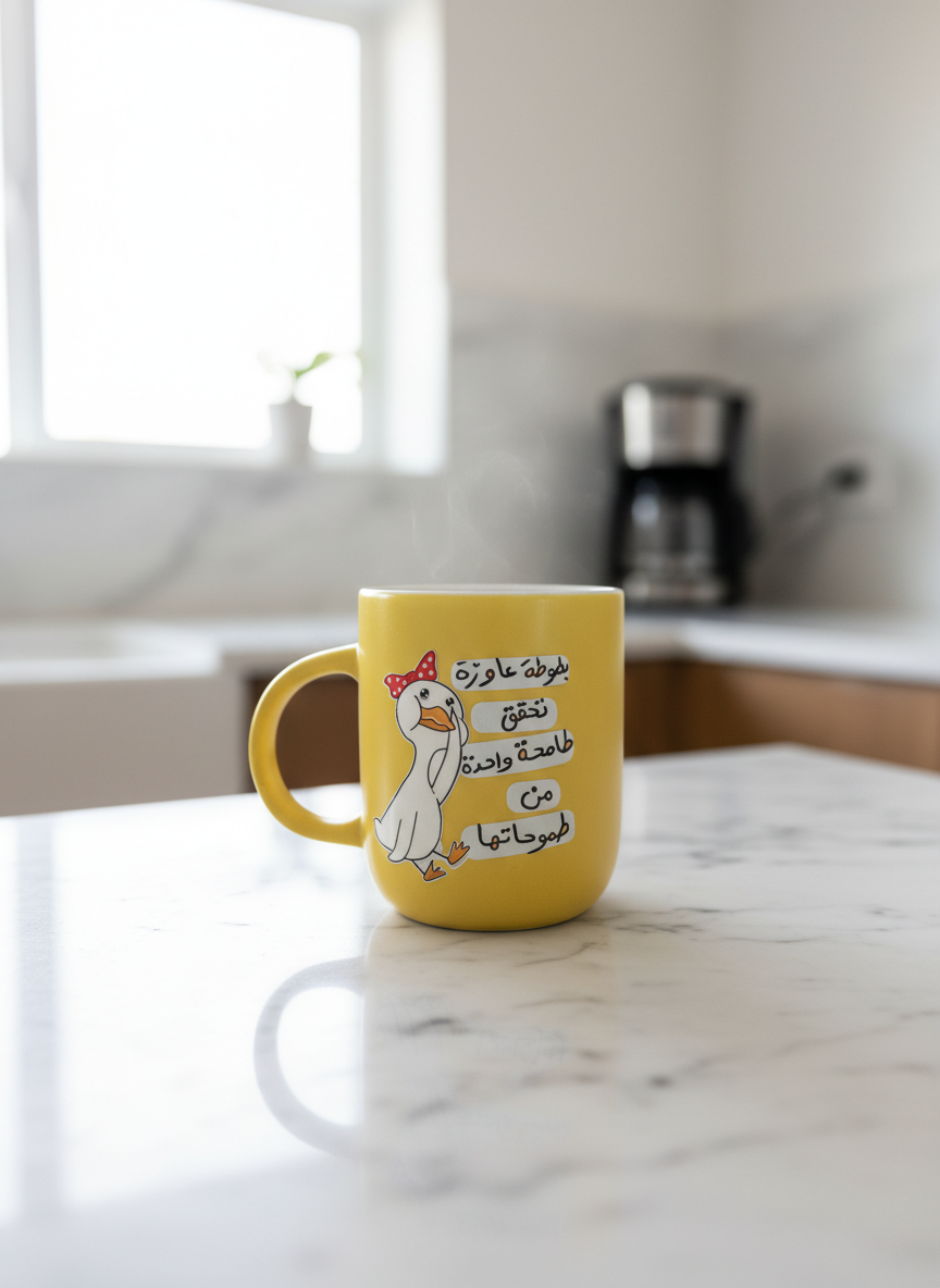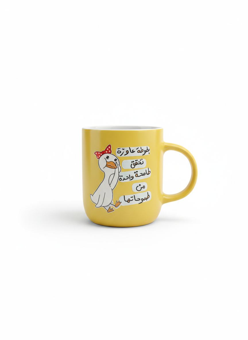 تخيلي تبدأي يومك وجرعة الكافيين تبعتك جوا هاد الكوب المليان إيجابية؟ 🐥 اللون الأصفر المشرق لحاله بيعدل المزاج، فكيف لما تشوفي “بطوطة” اللطيفة بفيونكتها الحمراء وهي عم بتخطط لمستقبلها؟ العبارة المكتوبة “بطوطة عاوزة تحقق طموحة واحدة من طموحاتها” هي تذكير يومي إلك إنه كل هدف كبير بيبدأ بخطوة صغيرة (أو طموحة واحدة). هاد الكوب مش بس للمشروبات، هاد “داعم معنوي” بضل معك على المكتب أو خلال الدراسة ليعطيكِ ضحكة وأمل إنك رح توصلي للي بدك اياه 🥹💪.