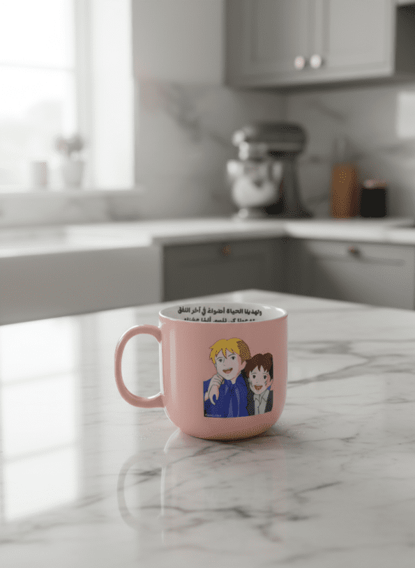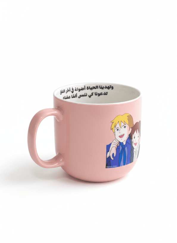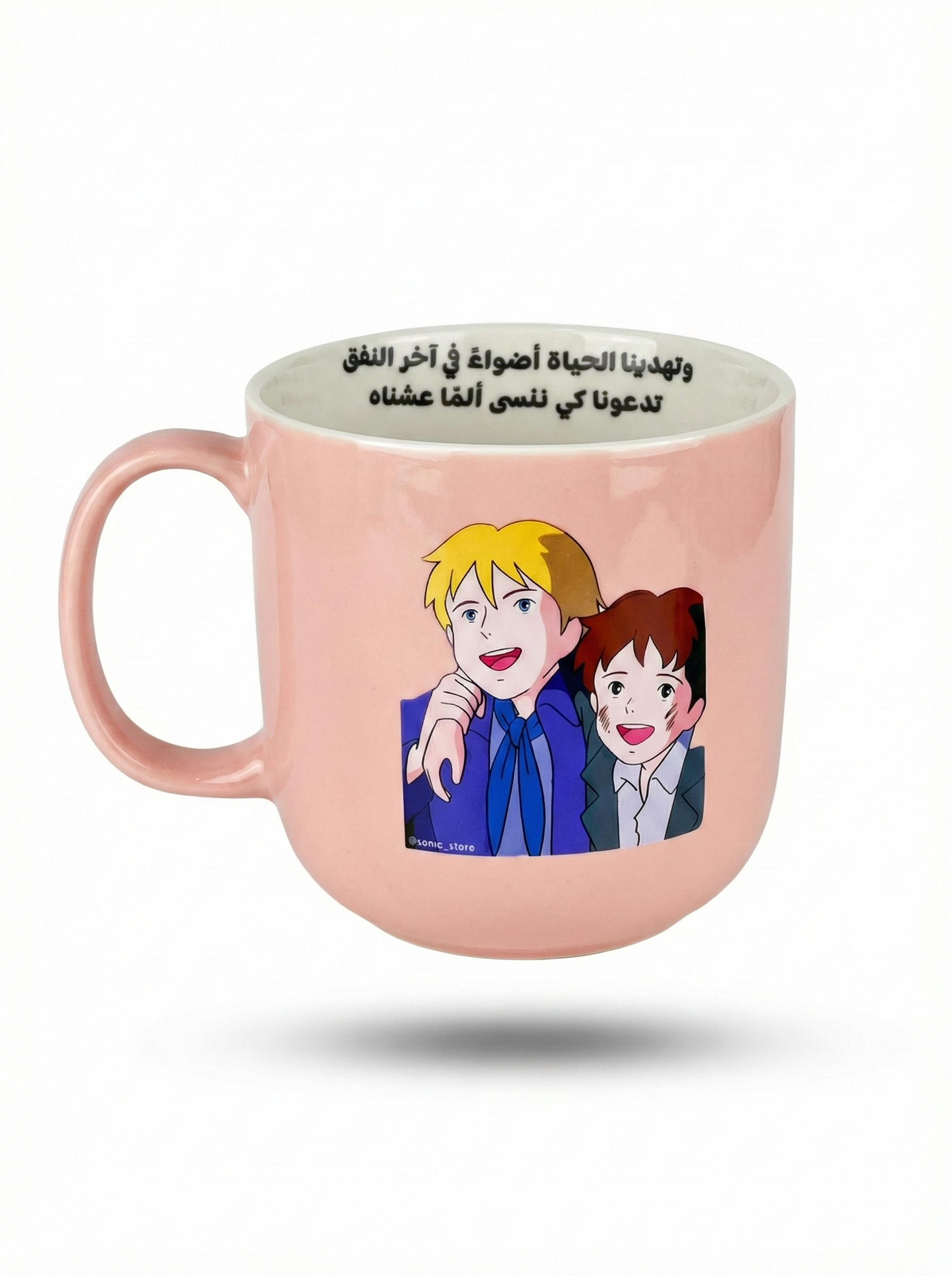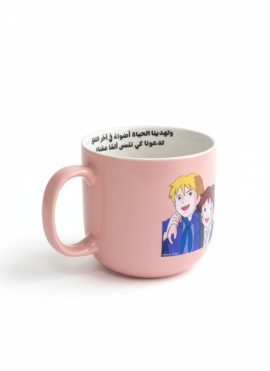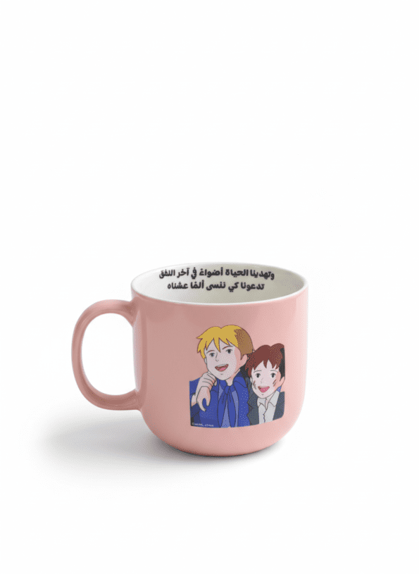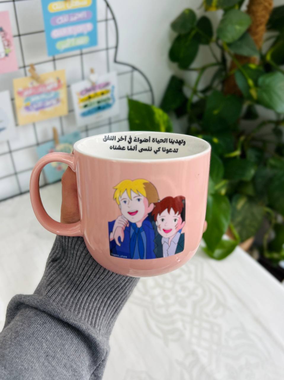 ذكريات الطفولة الدافئة تخيلي ترجعي بذاكرتك لأيام الكرتون والوفاء الصادق مع كل كاسة شاي؟ 🥺 هاد الكوب عليه رسمة “روميو وألفريدو” مع الكلمات اللي كبرنا عليها “وتهدينا الحياة أضواءً في آخر النفق”.. هدية مثالية لصديقة العمر، أو لحتى تدللي نفسك بقطعة مليانة حنين وأمل. اللون الوردي مع هالرسمة بيخطف القلب فوراً!