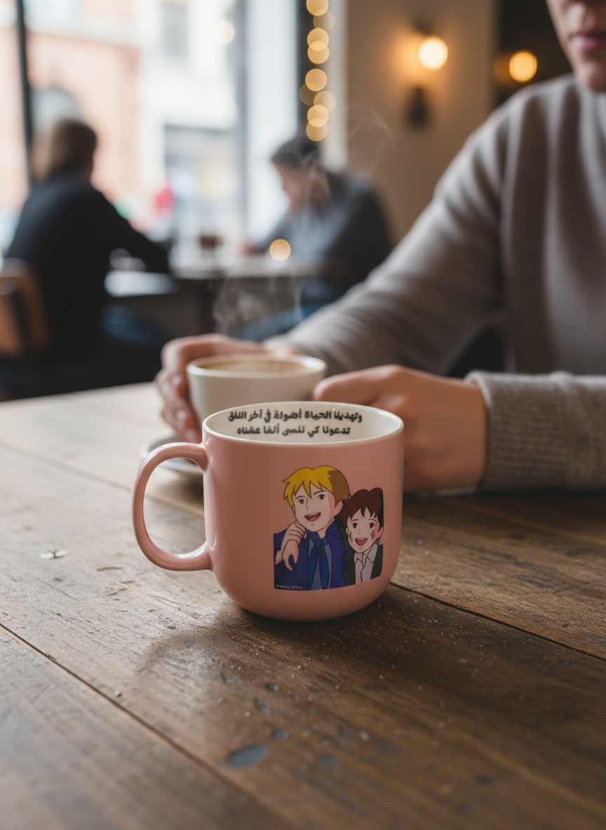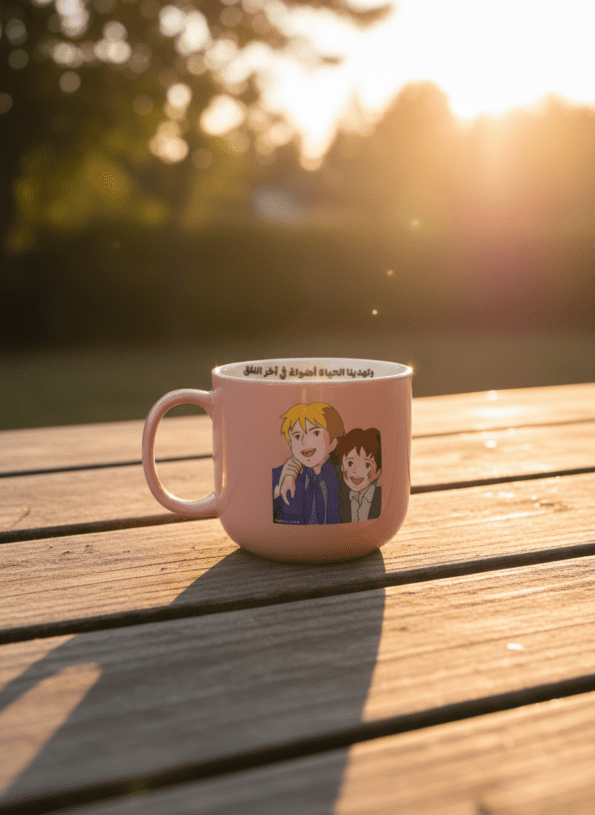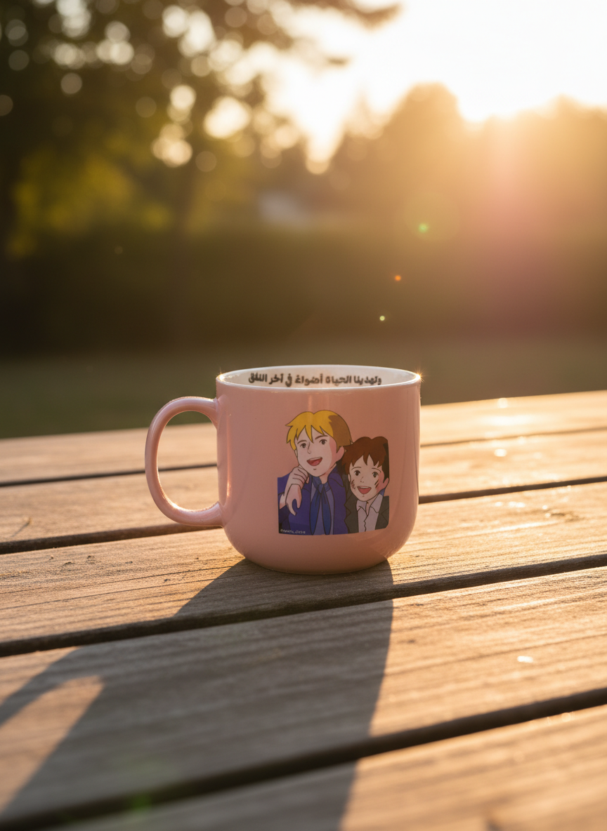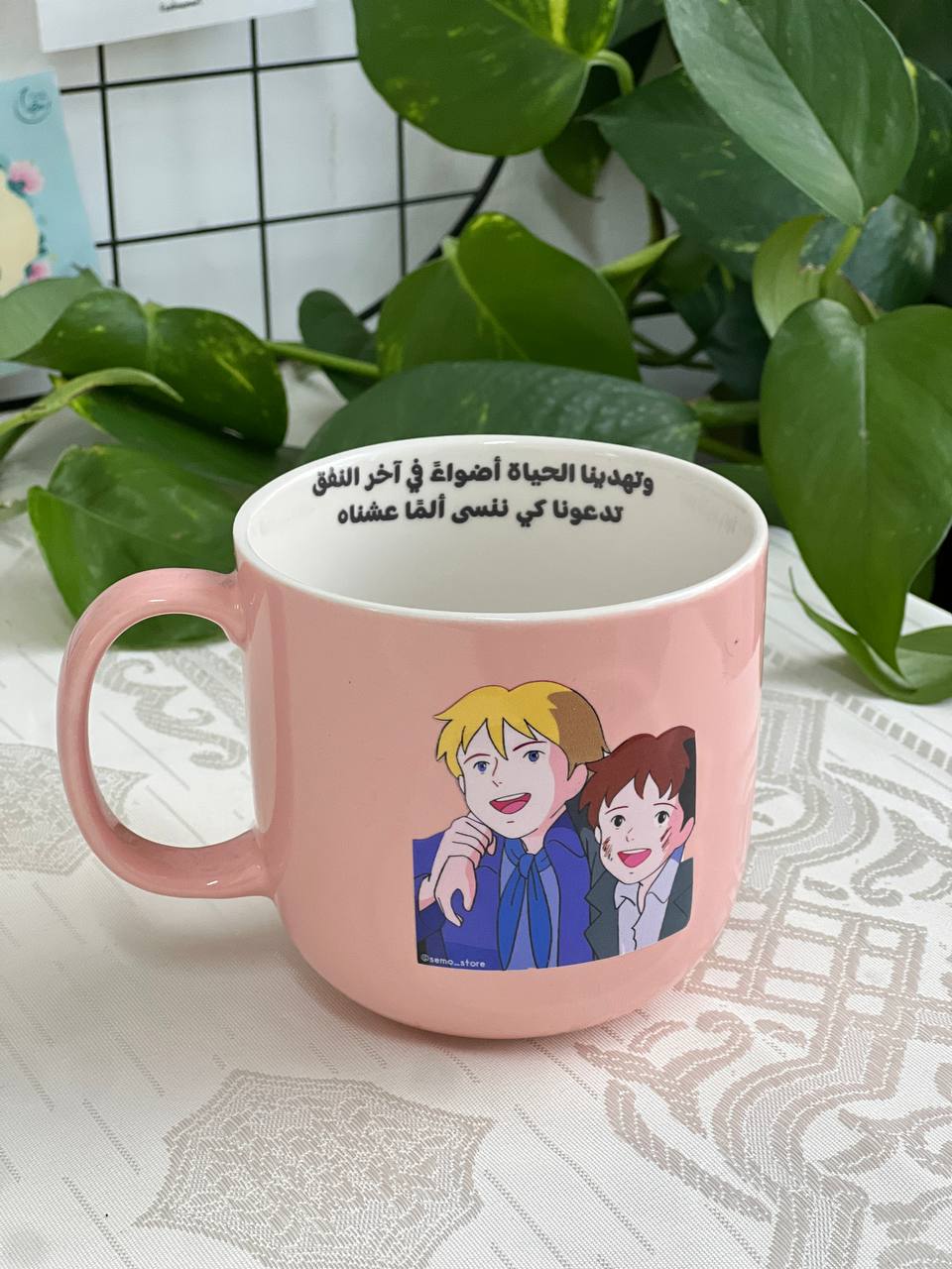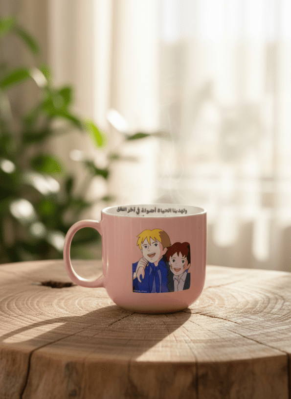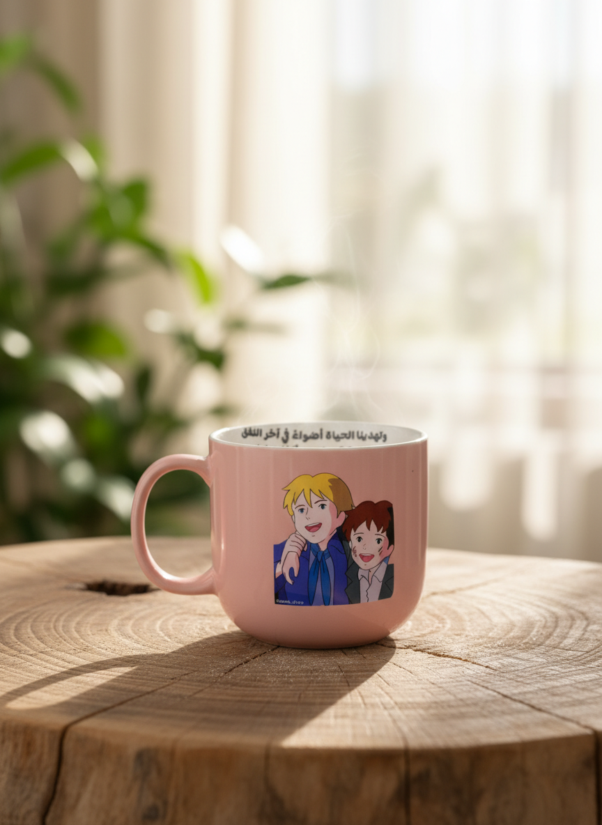 ذكريات الطفولة الدافئة تخيلي ترجعي بذاكرتك لأيام الكرتون والوفاء الصادق مع كل كاسة شاي؟ 🥺 هاد الكوب عليه رسمة “روميو وألفريدو” مع الكلمات اللي كبرنا عليها “وتهدينا الحياة أضواءً في آخر النفق”.. هدية مثالية لصديقة العمر، أو لحتى تدللي نفسك بقطعة مليانة حنين وأمل. اللون الوردي مع هالرسمة بيخطف القلب فوراً!